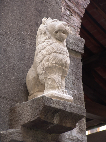 Sopra uno dei pilastri che sorreggono l’arcata deLLa Loggia del Mercato di Barga è collocato, scolpito in pietra serena, il leone, chiamato comunemente “Marzocco”, simbolo della Repubblica Fiorentina.
