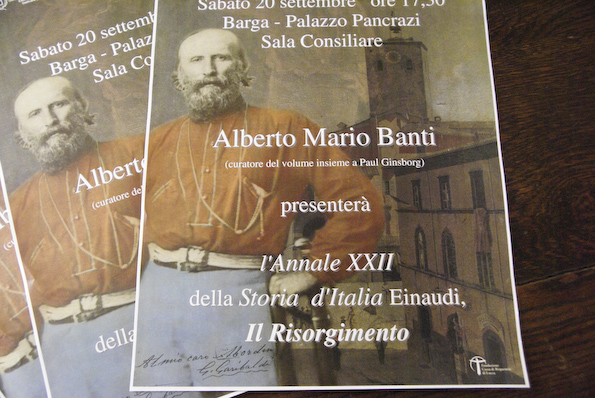 Sabato 20 settembre nella Sala Consiliare di Palazzo Pancrazi è stato presentato l’Annale XXII della Storia d’Italia di Einaudi, Il Risorgimento. Curato da Alberto Mario Banti e Paul Ginsborg.La presentazione è stata curato dallo stesso prof. Banti con il contributo del sindaco di Barga, Umberto Sereni che ha particolarmente voluto questo incontro.Nutrita la presenza di appassionati di storia, studenti universitari e studiosi a questa iniziativa che insieme al comune di Barga è stata organizzata dal Punto Einaudi di Lucca.L’incontro è stata anche l’occasione per parlare del libro di Banti, dal titolo “L’onore della nazione” edito anch’esso da Einaudi.