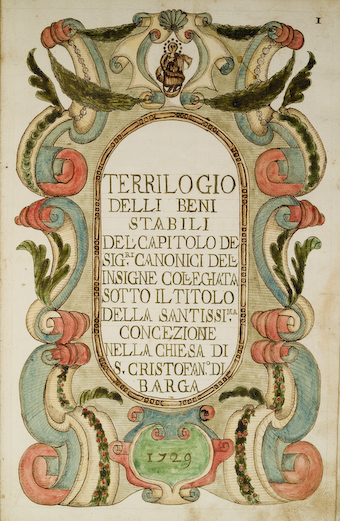 A pag.1 verso troviamo: il cartiglio colorato con inchiostri policromi, recante in alto, al centro, l’immagine stilizzata della S.S.Concezione. In basso, all’interno di un più piccolo cartiglio, l’anno della compilazione del Terrilogio: 1729.
