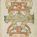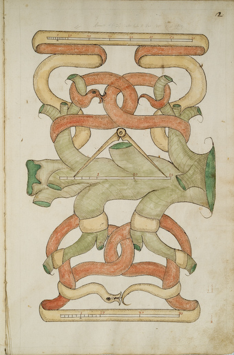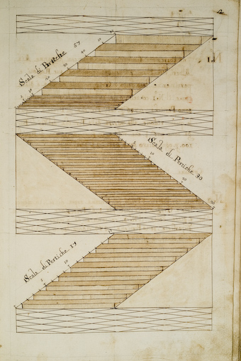 A pag.2 verso si trovano raffigurate le scale metriche, rappresentate in una allegoria colorata con inchiostri policromi, consistente in due biscioni che si attorcigliano ai rami di un tronco posto in orizzontale al centro del foglio, sul cui tronco è disegnata una scala sormontata da un compasso, recante le misure: 5, 10, 15. La scala in alto retta da un primo biscione reca le misure: 5, 10, 20, 30, 40, 50, 60, 70. La scala in basso retta dal secondo biscione reca le misure: 5, 10, 20, 30.