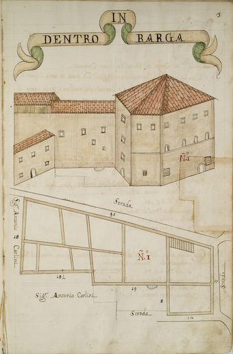 Canonica con più stanze e più appartamenti, con tutte sue ragioni e pertinenze, posta in Barga sotto il Duomo luogo detto al Marzocco: quale confina, e giace, come il N°1.