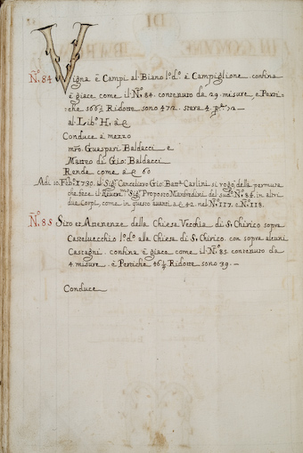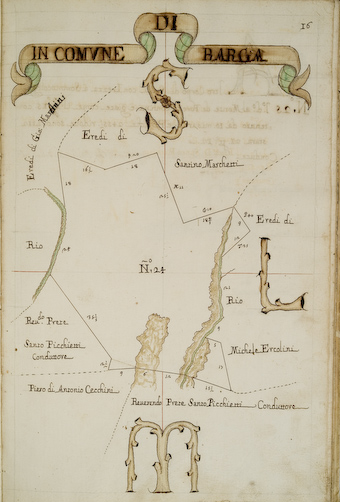 A pag.2 retto, inizia la descrizione dei beni, che nel retto del foglio vengono descritti secondo le voci usate nel Terrilogio precedente, mentre nel verso vicino, si dimostrano geometricamente nelle loro misure e confini. In alto si ritrova il solito cartiglio o nastro volante, al cui interno si dice dove sia il bene: “In Comune di Barga”. Anche qui ritornano, come in tutti i Terrilogi del Cecchi, le lettere iniziali formate da tronchetti, così come la lettera che indica il punto cardinale della disposizione del bene.