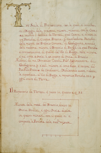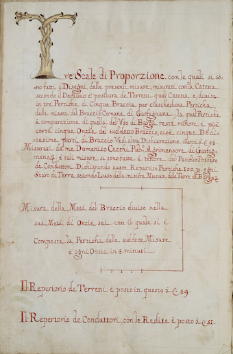 A pag.1 retto, si trova la presentazione del metodo usato nel lavoro e le scale usate da Domenico Cecchi: “Tre scale di proporzione con le quali si sono fatti i disegni delle presenti misure, misurati con la Catena secondo il declivio de terreni, qual Catena è divisa in tre Pertiche di cinque Braccia per ciascheduna Perticha, della misura del Braccio comune di Garfagnana, essendo della medema misura il Braccio di Barga: la qual Perticha a comparazione di quella del’uso di Barga resta minore e più corta 4 Oncie e un quarto di Oncia di Braccio.
