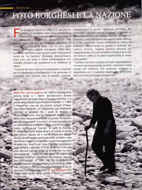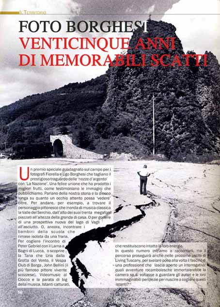 Professionisti di casa nostra che si fanno onore. Come ci segnala una nostra lettrice, la dott.sa Maria Pia Baroncelli, sulla rivista “Living Tuscany”, n.13, del marzo 2009 con in copertina la fotografia dello stilista Cavalli, all’interno (pp.56-57) si trova un bell’articolo a puntate dedicato a Foto Borghesi, il negozio di arte fotografica diretto dagli amici e bravi professionisti Ugo e Fiorella Borghesi. L’articolo è scritto dal Direttore de La Nazione, Giuseppe Mascambruno,e descrive il suo incontro venticinque anni fa con Ugo e Fiorella Borghesi che continuano ancora oggi ad essere una colonna portante de La Nazione di Lucca con i loro reportage fotografici dalla Valle del Serchio. Il suo pensiero sul loro lavoro è bene racchiuso ed interpretato dal titolo dell’articolo: “Foto Borghesi, venticinque anni di memorabili scatti”. Vi invitiamo a leggere la rivista che rende onore al lavoro professionale di due fotografi che hanno fatto la storia della fotografia nella nostra Valle.