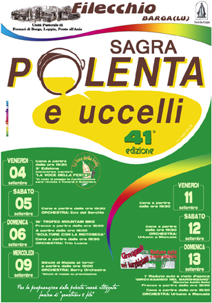 Fervono i preparativi per l’organizzazione dell’edizione 2009 della Sagra Polenta e Uccelli iniziativa promossa dalla Parrocchia di Santa Maria Assunta in Loppia, che quest’anno taglia il traguardo delle 41 edizioni. La manifestazione – la più longeva del comune di Barga ed una delle prime in tutta la Valle – si svolgerà dal 4 fino al 13 Settembre presso i locali parrocchiali di Filecchio chiudendo, come ormai tradizione, il calendario delle manifestazioni estive barghigiane.Anche per quest’anno i volontari della parrocchia hanno approntato un calendario di iniziative particolarmente ricco ed interessante. L’apertura avverrà in grande stile venerdì 4 settembre con la terza edizione del concorso canoro intitolato “La voce della Festa”: a sfidarsi saranno alcuni dei più talentuosi giovani cantanti della nostra zona in una serata che si annuncia certamente scoppiettante. A seguire, in ognuno dei due week end, a partire dalle ore 21,00, si esibiranno sul palco di Filecchio alcuni dei più conosciuti interpreti di liscio della zona. Nella mattina di domenica 6 sarà la volta dell’attesa 16^ edizione del trofeo MTB Filecchio organizzato dall’instancabile Edoardo Montanelli che, come ogni anno, sicuramente porterà i migliori bikers della zona a confrontarsi sul selettivo circuito filecchiese. La giornata prevede anche il consueto spettacolo della realizzazione dal vivo di sculture in legname per mano di esperti boscaioli, che daranno via alle proprie motoseghe a partire dalle ore 15.
