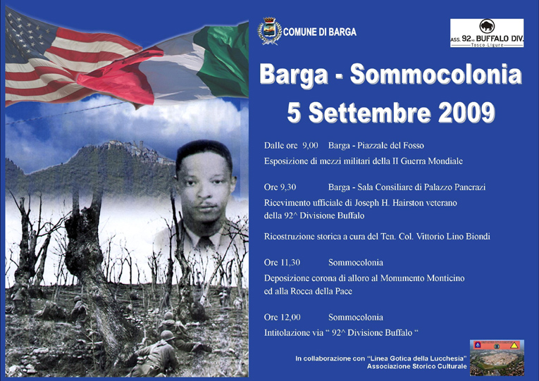 fratellanza mondiale. Allora era arrivata a Barga anche la vedova del tenente John Fox, l’eroe che nella Rocca di Sommocolonia si fece cannoneggiare dall’artiglieria amica, americana, per fermare l’avanzata delle truppe naziste. Un sacrificio ancora più grande perché compiuto per la libertà di una terra straniera. E sarà Mr Hairston a scoprire la targa di intitolazione della prima via in Italia come “Via 92^ Divisione Buffalo”. L’organizzazione della manifestazione è di Comune e Associazione 92ma Divisione Buffalo Tosco-Ligure con la collaborazione della Linea Gotica Lucchesia.