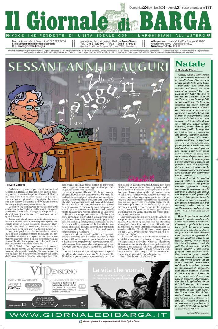 Con il prossimo numero 717 del 20 dicembre 2009, che arriverà tra pochi giorni nelle case degli abbonati ed in edicola, Il Giornale di Barga inaugura una nuova era nel segno del rispetto dell’ambiente. A cominciare dal supplemento di cronaca che accompagna il numero speciale di Natale, Il Giornale di Barga verrà stampato tutti i mesi su carta riciclata Cyclus Offset. L’operazione, voluta dal nostro direttore, aumenterà i costi relativi ala carta in quanto la carta riciclata purtroppo ha un costo maggiore rispetto a quella tradizionale, ma vuole essere un piccolo esempio di sensibilità ai problemi ambientali e soprattutto alla necessità di riciclare ed utilizzare prodotti riciclati.Siamo certi che i nostri lettori apprezzeranno questa nostra iniziativa che conferma la costante attenzione del periodico barghigiano ai problemi legati all’ambiente.