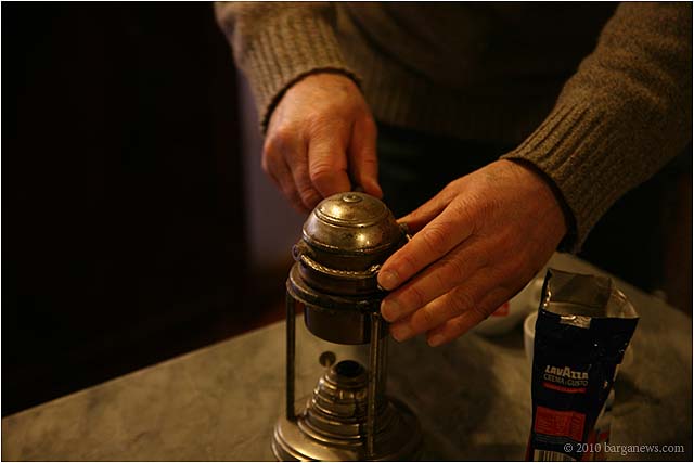 (il foto servizio si referisce alla moka Aquilas ed è stato realizzato da barganews.com)Barganews.com e Giornaledibarga.it i portali di informazione online di Barga, organizzano per il quarto anno consecutivo “M’illumino di meno… da Aristo”.Barga si inserisce così a pieno titolo nella iniziative intraprese nell’ambito della campagna “M’illumino di meno” promossa dalla trasmissione Caterpillar di Radio2 e che si terrà la sera del prossimo 12 febbraioAll’antica bottega di mescita Da Aristo in piazza Salvo Salvi, uno dei luoghi storici della “Barga d’altri tempi”, luci spente, illuminazione fornita da una dinamo alimentata da una bicicletta da spinning dove pedaleranno a turno diversi partecipanti in costume d’epoca; concerto rigorosamente acustico dei musicisti di BargaJazz e accensione della prima moka da caffè prodotta in Italia nel 1910. Interessante la storia di questa macchina da caffè. Si tratta del modello Aquilas prodotto dai Fratelli Santini di Ferrara. E’ stata la prima moka realizzata in Italia ed a Barga arrivò direttamente da Ferrara nel 1910. Fu acquistata per preparare il caffè per i clienti della Bottega poi divenuta di