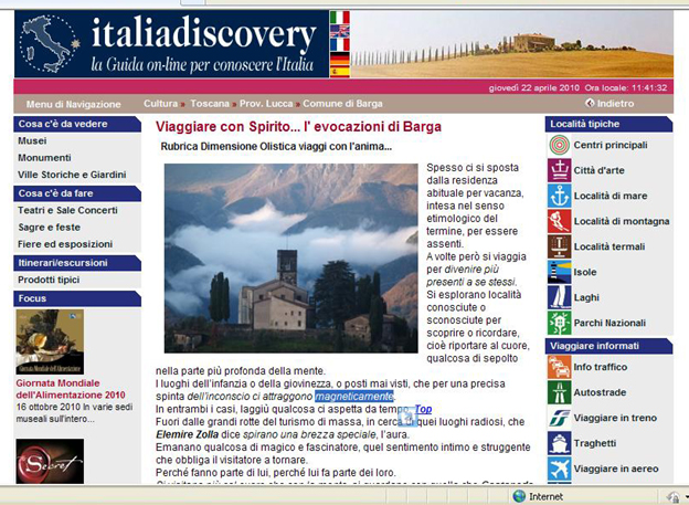 Riportiamo orgogliosamente quanto ci segnala Silvia Petruzzelli, titolare con il compagno del Bed & Breakfast “Il Melograno nano”, a Filecchio, che questa mattina ci ha inviato un messaggio e un indirizzo internet: “Uno dei nostri ospiti, affascinato dalle bellezze di Barga e dal calore dell’accoglienza ricevuta, ci ha inviato il link ad un articolo (riguardante Barga) da lui scritto e pubblicato sul portale Italia Discovery (portale con 120 mila visite al mese) con cui collabora.”
