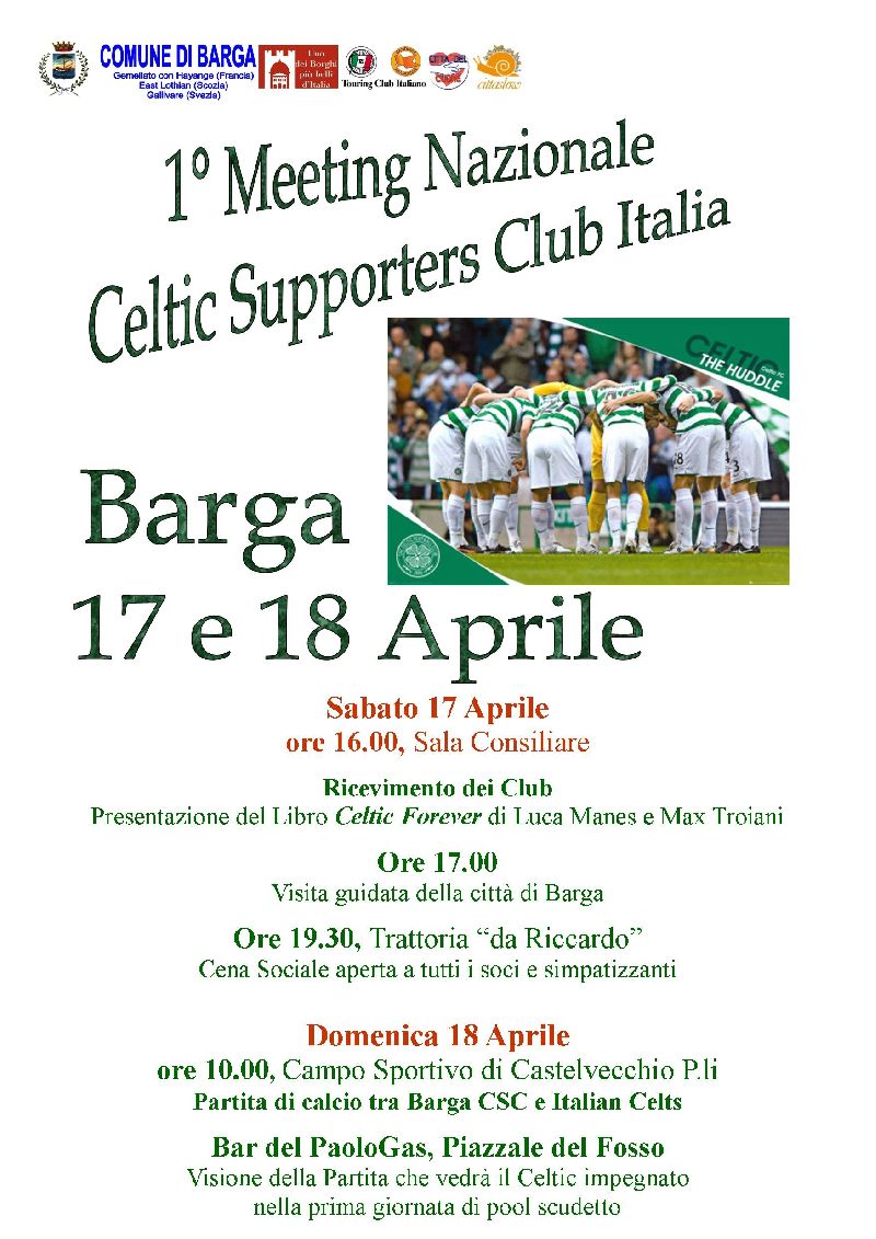 Il via al meeting sabato alle 16 quando nella sala consiliare di Palazzo Pancrazi , dopo i saluti ufficiali dell’Amministrazione, sarà presentato il libro Celtic Forever scritto da Luca Manes e Max Troiani. Alle 17, visita guidata alla cittadina. In serata si terrà invece la cena sociale presso la Trattoria da Riccardo e la mattina di domenica 18 aprile (ore 10) si svolgerà presso il campo sportivo di Castelvecchio Pascoli l’amichevole tra BargaCSC e Italian Celts. Il Bar del PaoloGas (Piazzale del Fosso) ospiterà invece i fans per seguire il Celtic impegnato nella prima giornata di pool scudetto.
