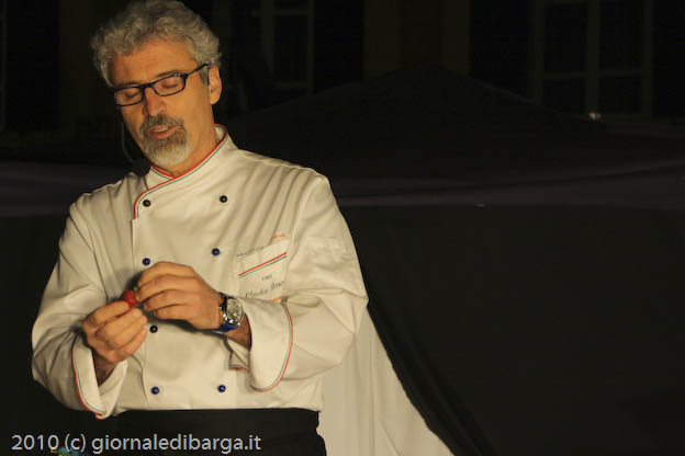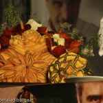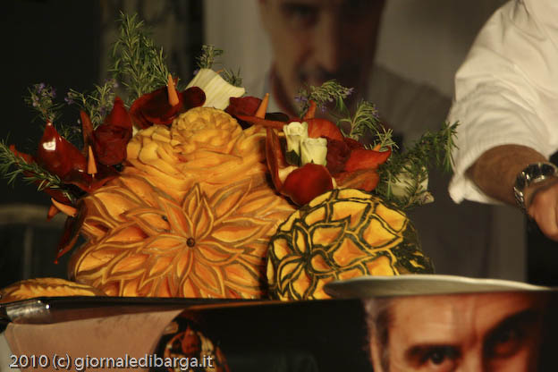 Menconi, affiancato da due collaboratori, (ed inquadrato in un maxi schermo sotto la regia di Ugo Borghesi) ha tenuto la piazza incollata alle sedie dimostrando con quanta semplicità da frutta e verdura si possono ricavare pinzimoni e macedonie panoramiche, intrattenendo il pubblico non solo con la sua manualità ma anche con aneddoti sulla sua singolare professione. Gran finale, poi messo in palio con una lotteria, un prosciutto bazzone intagliato nella polpa a formare un fiore.