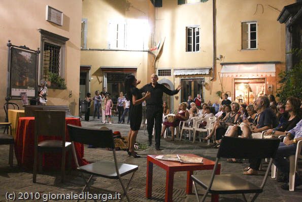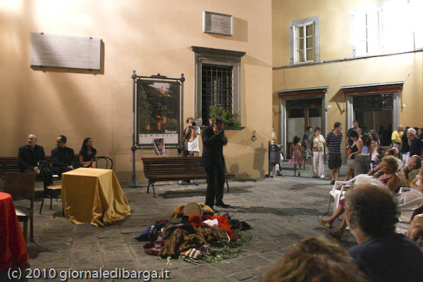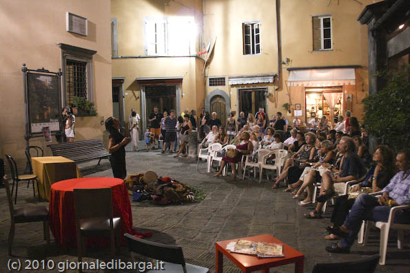 Sistemate alcune sedie a semicerchio sotto la stele medicea, lo spettacolo ha preso il via, e, con in scena una panchina, qualche tavolino e un “mucchio” di abiti e oggetti per creare le situazioni, i bravissimi attori (Alessandro Lutri, Elisa D’Agostino, Massimiliano Picchi, Valeria Belloni, Maria Colombini e Luciano Gassani sotto l’occhio vigile del regista Roberto Pecchia) hanno riempito la piazza e tenuto incollati alle sedie tutti per un paio di ore con “I pazzi”.