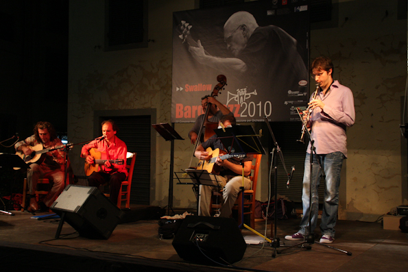 Se il buongiorno si vede dal mattino bisogna proprio dire che l’edizione 2010 del Bargajazz festival si è aperta come meglio non si poteva. Un ottimo concerto quello andato in scena ieri sera in piazza Angelio; fatto da bravissimi artisti e ricco di ottima musica. Ma anche un pubblico dalle grandi occasioni che ha riempito Barga di appassionati del jazz e che ha confermato, se ancora ce ne fosse bisogno, che il festival jazz barghigiano è ben molto di più che un diamante grezzo; la punta di diamante, sarebbe meglio dire, del migliore jazz che si produce in Toscana.In una gremitissima piazza Angelio BargaJazz ha preso il via con il Maurizio Geri Swing Quintet, un omaggio a Django Reinhardt nel centenario della nascita. Maurizio Geri è uno degli interpreti più importanti del genere a livello nazionale e presenta un repertorio che spazia dalla tradizione manouche a brani originali. La formazione era composta oltre che da Maurizio Geri chitarra/voce, da una “swing machine” composta da Leonardo Boni e Luca Giovacchini alle chitarre, Nicola Vernuccio al contrabbasso e dal giovane Michele Marini al Clarinetto, già vincitore nella sezione giovani del BargaJazz Contest 2009.Per loro alla fine tanti applausi e la richiesta a gran voce di un bis che per fortuna non è mancato, regalando ancora qualche minuto di bella musica a tutti.
