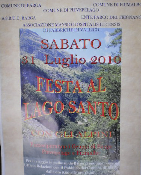 Organizzata insieme (Barga, Fiumalbo e Pievepelago), nel più puro spirito dell’amicizia tra i popoli di qua e di là dall’Appennino, si è svolta sabato 31 luglio l’edizione 2010 della “festa al lago Santo”, un luogo simbolo che accumuna le tre comunità la cui storia si intreccia proprio sulle sponde del bellissimo lago alpino.La manifestazione ha visto anche la collaborazione organizzativa dell’ASBUC Barga, dell’ente Parco del Frignano e dell’Associazione Mansio Hospitalis Lucensis di Fabbriche di Vallico, presente con i propri figuranti storici.Nutrita come sempre e particolarmente appropriata anche la presenza dei gruppi Alpini di Barga, Pievepelago e Fiumalbo.La giornata si è aperta con la messa celebrata alla cappellina del lago dal nostro proposto don Stefano Serafini e con il saluto delle autorità che vi hanno preso parte a cominciare dal nostro sindaco, Marco Bonini. Poi il “rancio” preparato per tutti dai volenterosi alpini.Tanti sono stati i partecipanti alla festa provenienti dal nostro comune.