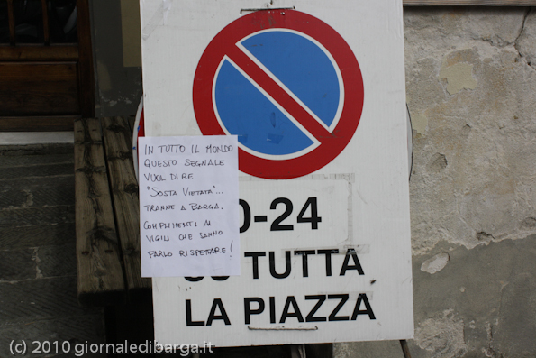 Domenica scorsa, per onore di cronaca, le macchine parcheggiate in piazza hanno anche ostacolato la mostra d’arte di cui parlavano sopra e sul cartello di divieto di sosta che si trova in piazza è apparso anche un cartello con su scritto: “In tutto il mondo questo segnale vuol dire divieto di sosta… tranne che a Barga… Complimenti ai vigili che sanno farlo rispettare”.