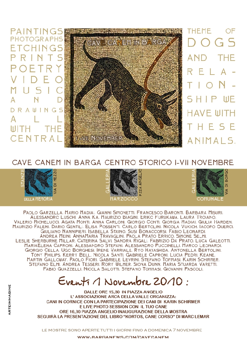 Sono settantadue gli artisti in mostra per l’iniziativa Cave Canem, che ha riempito gli spazi espositivi del centro storico di Barga con quadri, foto, poesie, una video installazione, una narrazione in musica e addirittura una ricetta di cucina per parlare del nostro amico peloso.Ieri l’inaugurazione dei tre spazi, la Galleria il Marzocco in Piazza Angelio, la Galleria Comunale e le Stanze della Memoria, introdotti dalle parole del vicesindaco Alberto Giovannetti e di Keane, curatore della mostra barghigiana con i tagli del nastro affidati all’assessore all’ambiente Giorgio Salvateci, all’artista barghigiana Sandra Rigali e all’ ideatrice della mostra Giorgia Madiai.In molti hanno sfidato la pessima giornata per assistere all’inaugurazione e riversarsi nelle sale per curiosare tra le tante idee di rapporto uomo-cane espresse dagli artisti, in una sorta di passeggiata tra la piazza principale, via di Borgo e via di Mezzo, fermandosi poi a lungo in piazza Angelio dove è stato offerto dagli organizzatori un aperitivo.