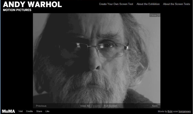 Si tratta dell’ Andy Warhol Motion Picture, ossia, una serie di filmati lunghi 90 secondi in cui ognuno di noi può apparire, a patto che l’immagine sia ripresa da telecamera fissa e il volto non abbia espressioni, così come i suoi celebri “provini” realizzati con le celebrità.