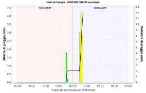 Si tratta di fenomeni isolati e locali, che colpiscono a macchia di leopardo e che possono scaricare diversi mm di pioggia in pochi minuti in un luogo e lasciarne all’asciutto un altro a pochi km di distanza. Dando un’occhiata ai pluviometri dell’Autorità di Bacino del Serchio vediamo come nella notte siano caduti ben 12 mm a Ponte di Campia (vedi foto) mentre a Gallicano solo 0,8, Vagli 1,4 e 4,6 sul Monte Macina. Questi dati rendono più di ogni altra parola l’idea dell’eccezionalità di questo fenomeno e del fascino che ha questa scienza, pronta a regalare emozioni a non finire, anche a costo di commettere qualche errore.