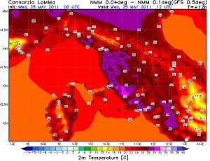 Oggi sarà la giornata più calda del periodo con la possibilità di arrivare sino a 33 gradi (nella foto le temperature previste al suolo per oggi alle ore 14). Da giovedì l’alta pressione inizierà un parziale ritiro con temperature leggermente meno calde e qualche spunto instabile tra venerdì e sabato. Anticiclone di nuovo alla carica da domenica.
