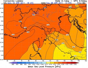 Le ultime emissioni delle carte confermano l’impianto generale delle configurazioni bariche nei prossimi giorni. L’anticiclone delle azzorre avanzerà timidamente verso le nostre regioni per poi lanciarsi alla conquista dei nostri territori a partire da domenica, portando molto sole e temperature in aumento. Fino ad allora la giornate trascorreranno, nel complesso, tranquille e senza eccessi con sole al mattino, nubi in aumento al pomeriggio con addensamenti anche intensi ma che non daranno luogo a precipitazioni. Maggiore nuvolosità è prevista per la giornata di venerdì ma senza conseguenze poi… tanto sole. Le temperature raggiungeranno i 30 gradi, valore assolutamente normale in questo periodo dell’anno, siamo, ormai, in estate (nella foto la pressione atmosferica prevista per la tarda mattinata di domani).