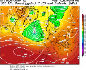 Una profonda area depressionaria ad ovest dell’Irlanda (vedi foto) proverà a guastare i progetti di conquista dell’anticiclone delle Azzorre che, timidamente, sta espandendosi verso le nostre regioni. Tale depressione, nel suo movimento verso est, nelle prime ore di domenica avrà il suo perno sulla Danimarca, influenzerà parzialmente il tempo della nostra Penisola con nubi e fenomeni che colpiranno in particolar modo le zone alpine ma con riflessi anche sulle nostre zone. Non avremo piogge ma solo un aumento della nuvolosità e, più in generale, un passaggio di nubi alternate a schiarite, sopratutto tra venerdi e sabato. Al momento migliore parrebbe la giornata di domenica.