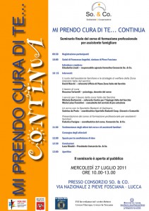 Un corso di formazione per assistenti familiari, ma anche un anno di intensa attività per lo sportello badanti di Gallicano. Si svolgerà mercoledì 27 luglio dalle ore 10, presso la sede So. & Co. di via Nazionale 12, l’incontro “Mi prendo cura di te … continua”. L’appuntamento celebra la conclusione del progetto di formazione professionale obbligatoria per assistenti familiari svoltosi a Pieve Fosciana a cura dell’Agenzia Formativa So. & Co., finanziato dalla Provincia di Lucca.