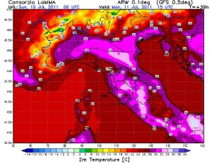 Il caldo dominerà incontrastato per altri tre giorni con il clou tra martedì e mercoledi quando una depressione nata sulla Spagna e sulla Francia tenderà a muoversi verso le nostre regioni. Il primo risultato sarà un aumento del caldo e dell’afa a causa del richiamo di aria da sud con temperature che potranno raggiungere i 35 gradi anche sulle nostre zone. Particolarmente intensa sarà l’ondata di caldo per la Sardegna e le regioni meridionali dove potremo superare, localmente, anche i 40 gradi.