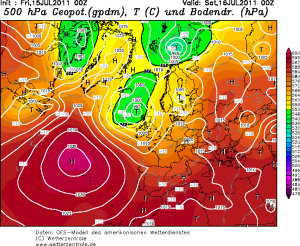 Il tempo sta lentamente cambiando e, uscendo di casa questa mattina, abbiamo potuto apprezzare l’aria più fresca giunta nella giornata di ieri sulla nostra Regione. Anche il cielo presenta addensamenti, localmente intensi, ma che non danno luogo a precipitazioni (nella foto la distribuzione barica a livello europeo). Fa ancora caldo nelle ore centrali della giornata ma è assolutamente normale: siamo in pieno luglio ed il sole fa schizzare verso l’alto le temperature raggiungendo ancora valori di 30-32 gradi. Anche queste ultime, tuttavia, subiranno una leggera diminuzione e tra oggi ed il week end non dovremmo più superare i 30 gradi. Più fresco quindi ma senza piogge. Per quelle dovremo attendere ancora qualche giorno quando, tra lunedì sera e mercoledì, aria fredda arriverà da ovest scavando una depressione sul tirreno settentrionale che porterà temporali diffusi, anche di forte intensità.