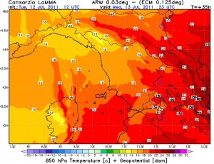 Mercoledì 13 luglio: cielo sereno salvo qualche passaggio di nubi alte e stratificate, ancora caldo afoso nelle ore centrali della giornata con temperature massime tra 33 e 35 gradi. Nella sera e nella notte arriva aria meno calda in quota con associato aumento della ventilazione e lento calo delle temperature (nella foto le temperature previste nella prossima notte a 1.500 m di altezza).