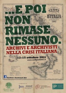 È indubbiamente un onore e uno sforzo quotidiano assolvere un compito così gravoso; tanto più nei tempi difficili in cui viviamo. Purtroppo, in questi ultimi anni la crisi economica ha colpito il settore culturale e, in particolar modo, quello archivistico: gli archivi sono sempre stati la “Cenerentola” dei beni culturali, i primi a soffrire dei continui tagli e ridimensionamenti imposti. Una realtà sconosciuta ai molti; chi però frequenta quotidianamente questi ambienti come utente si può facilmente render conto delle tangibili difficoltà vissute da questi istituti, dal loro personale e dai fruitori. Una situazione che, viste le risorse sempre più scarse investite in questo settore, non è destinata a migliorare col tempo. Per richiamare l’attenzione sul disastro cui si sta andando incontro, l’ANAI (Associazione Nazionale Archivistica Italiana), in collaborazione con società di studi storici e con un’enorme parte dell’amministrazione archivistica statale e non statale, organizza quattro giorni di iniziative di denuncia e protesta su tutto il territorio nazionale. All’evento, che si terrà dal 12 al 15 ottobre, è stato dato il significativo titolo di “…e poi non rimase nessuno. Archivi e archivisti nella crisi italiana”.