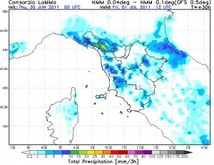 Venerdì 1 luglio: cielo sereno al mattino con rapido aumento di nubi cumuliformi in tarda mattinata ed al pomeriggio associata a locali brevi rovesci o temporali (nella foto le precipitazioni previste per il pomeriggio). Temperature massime tra 27 e 29 gradi, venti deboli di grecale.