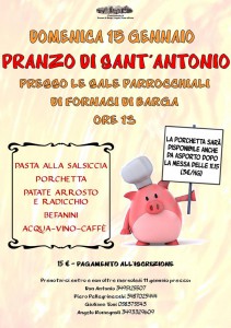 Per quanto riguarda la parte più profana, ci si sposta per motivi di funzionalità dal borgo vecchio ai locali parrocchiali del Cristo Redentore. Quest’anno infatti la parrocchia propone, domenica 15 gennaio alle ore 13, un pranzo conviviale di Sant’Antonio a base di pasta alla salsiccia, porchetta con patate arrosto e radicchio, befanini; tutto compreso per 15 €. La quota va versata al momento dell’iscrizione, da effettuare presso Don Antonio, Piero Pellegrineschi, Giuliana Toni o Angelo Romagnoli entro e non oltre mercoledì 11. Ad ogni modo la porchetta sarà disponibile nello stesso giorno anche da asporto, fuori dalla chiesa del Cristo Redentore al termine della messa delle 11.15.