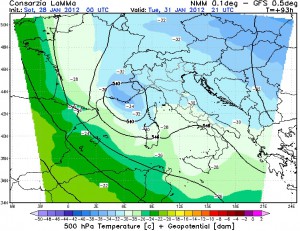 Sabato 28, ore 8.20: La prima colata fredda è in azione sulla Francia e proseguirà il suo cammino andando ad interessare principalmente le Baleari. La depressione associata manterrà attive correnti meridionali sulle nostre zone con molte nubi e deboli precipitazioni, nevose solo oltre i 1.000 metri. Attenzione poi a martedi. Nella foto potete vedere la situazione per il pomeriggio del 31: il nucleo gelido si è appena tuffato nel Mediterraneo dalla porta del Rodano, beh, con carte come questa ci aspettiamo neve, anche copiosa, fino nei fondovalle. Tutti i modelli si stanno allineando a questa evoluzione che ormai darei per molto probabile (80%). L’esatto posizionamento del minimo depressionario, che potremo valutare solo lunedi pomeriddio/sera, determinerà quantità e durata delle precipitazioni. Attenzione poi all’aria gelida in arrivo da est nei giorni successivi, saranno giornate difficili, iniziamo a prepararci. Non voglio creare inutili allarmismi ma le premesse per vivere giornate con neve e gelo esteso ci sono tutte, meglio un’allerta inutile in piu che farsi trovare impreparati… Se veramente le carte si confermeranno nelle prossime uscite, beh, ci ricorderemo per molto tempo del febbraio 2012….