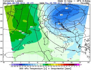 Un nucleo di aria gelida si sta avvicinando a grandi passi verso il nostro Paese (nella foto la posizione prevista per giovedi sera) ed impatterà il nord-est Italia nella serata di giovedi apportando un nuovo, intenso, episodio di maltempo invernale con nevicate intense e persistenti sui settori esposti e forti venti di tramontana sulle nostre zone.