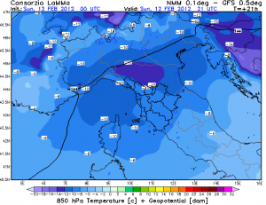 Mentre continuano le intense nevicate sulle regioni adriatiche dove, nei paesi dell’entroterra la situazione è veramente disperata con accumuli anche di 2-3 metri, le nostre zone hanno beneficiato dell’azione di schermatura offerta dal nostro appennino che ha impedito alle nevicate di estendersi ai fondovalle. Le correnti tese orientali hanno nuovamente determinato un aumento dei venti che soffiano tra il moderato ed il forte, sopratutto nelle zone esposte. Le temperature si mantengono su valori molto bassi, nella foto vediamo quelle previste per la serata odierna alla quota di circa 1.500 metri.