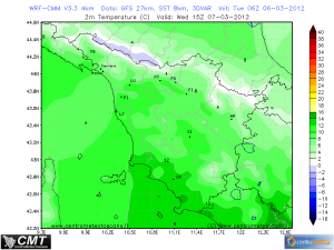 Mercoledi 7 marzo: cielo sereno con locali gelate al mattino, sopratutto nelle zone piu riparate dal vento. Dalla sera aumento delle nubi da ovest. Temperature massime comprese tra 8 e 12 gradi (vedi foto).
