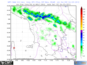Sabato 24 – Domenica 25 Marzo: tempo migliore al mattino e durante la sera, dalla tarda mattinata tendenza ad aumento delle nubi cumuliformi con qualche locale rovescio non escluso ma di difficile localizzazione (nella foto le precipitazioni previste per il pomeriggio di sabato). Temperature stazionarie.