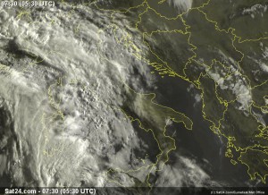 Guardando dal satellite (vedi foto) si nota della nuvolosità che da ovest della Sardegna ricopre tutta l’Italia sino a Triveneto. Tale area nuvolosa si muoverà verso nord est interessando anche in maniera diretta la nostra zona.