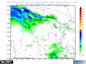 Questa breve tregua del maltempo sta giungendo al termine. Già nella mattina di domani assisteremo ad un progressivo ed inesorabile aumento delle nubi fino a cielo coperto nel pomeriggio con le prime deboli precipitazioni in serata. Un ulteriore peggioramento lo avremo nella notte quanto le piogge si faranno piu intense (nella foto le cumulate tra le 18 di martedi e le 06 di mercoledi) e persistenti. Sarà l’inizio di una lunga fase di tempo instabile, a tratti perturbato, che metterà radici sulle nostre zone per almeno una settimana. Non pioverà, ovviamente, in modo continuo per tutti i giorni, ma saremo interessati da una serie di impulsi instabili che recheranno molte precipitazioni, ottime per far rientrare l’allarme siccità che avevamo lanciato nei giorni scorsi.