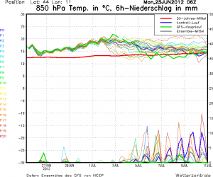 A seguire, come si evince dal grafico “spaghetti”, la tendenza generale va verso un nuovo break, probabilmente accompagnato da qualche precipitazione. A determinare ciò parrebbe essere una depressione in arrivo da ovest che determinerebbe, appunto, un calo delle temperature e qualche temporale.