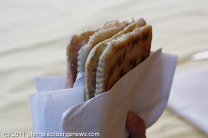 E’ così che assume quel aspetto bronzato, croccante, invitante, da gustare in purezza o anche accompagnato, anzi “riempito” con affettati e formaggi locali, ma anche con marmellata e crema di nocciole.