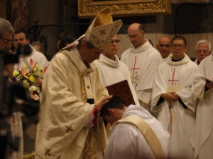 Alcuni di noi avevano già partecipato all’ordinazione di un sacerdote mentre per altri era la prima volta; il fatto di conoscere il candidato ha caratterizzato particolarmente i momenti forti della liturgia, come il canto delle litanie dei santi con i due giovani stesi a terra in segno di umiltà e di preghiera. Altro momento significativo e commovente è stato il gesto antichissimo della Chiesa dell’imposizione delle mani da parte del Vescovo sui due ordinandi, di tutti i sacerdoti concelebranti e della successiva vestizione con gli abiti sacerdotali. Coinvolgente è stato l’ abbraccio con il Vescovo e, uno ad uno, con i confratelli sacerdoti. Al termine della S. Messa una grande applauso incontenibile di gioia ha salutato i due giovani preti don Salvatore e don Francesco.