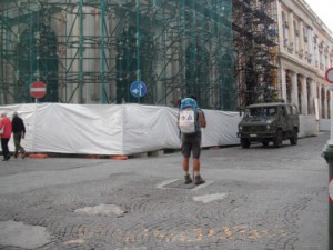 Scopriamo così che di aquilani in giro ce ne sono pochi, che gli stessi aquilani non sanno bene dove si può passare e dove no, che la città è (o meglio dovrebbe essere) un immenso cantiere.