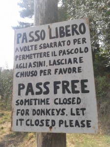 A volte, purtroppo, si rimane delusi e il nostro cammino si arresta di fronte ad un incomprensibile cancello improvvisamente comparso a sbarrare una strada o un sentiero. Proprio in questi giorni, però, mi è capitato di tornare lungo uno degli itinerari creati anni fa dal Comune di Massarosa (LU) e, dopo la brutta avventura del cancello che mesi fa ha interrotto per alcuni giorni il sentiero “00” del Monte Pisano, mi sono riempito il cuore con un cartello che era scomparso dai cassetti della mia memoria. “Passo libero a volte sbarrato per permettere il pascolo agli asini. Lasciare chiuso per favore”, si legge sul cartello. Segue la traduzione in inglese.