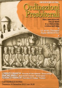 Domenica 30 infatti due pullman partiranno da Fornaci per portare i tanti amici a festeggiare il novello presbitero: per mano di Mons. Giovanni Paolo Benotto, Arcivescovo di Pisa, saranno ordinati sacerdoti Lorenzo, il pontederese Federico Franchi, che da un anno sta svolgendo un encomiabile servizio presso l’Unità Pastorale di Barga e Simone Binelli, che Barga ricorda con affetto e stima per avervi prestato servizio due anni fa. L’ordinazione avrà luogo alle ore 18,00 presso il Duomo di Pisa.