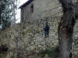 Lo ammetto, quando alzato lo sguardo verso l’Eremo di Capraia, lungo uno dei Sentieri del Moro, ho avvertito una strana sensazione, quasi mi sono spaventato. In realtà, è solo con la coda dell’occhio che ho riconosciuto una sagoma scura simile ad una persona. Una reazione quasi primordiale mi ha portato ad avvicinarmi, istintivamente, a mia figlia prima di guardare meglio. No, non c’era un’uomo vestito di nero sospeso per aria contro il muro che sostiene il basamento dell’eremo, ma solo una macchia di umidità dalla forma assai bizzarra e simile alla sagoma di un uomo.