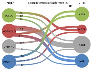 Il dato, però che merita maggiore approfondimento è quello relativo alla superficie agricola e urbanizzata. La superficie agricola perde circa 4.500 ettari (un ettaro corrisponde, per capirsi, a circa due campi da calcio), 3.600 dei quali si trasformano in aree urbane. Questo significa una drastica diminuzione delle superfici permeabili, cioè che assorbono la pioggia durante eventi come quelli di questi giorni, e, con ogni probabilità, un aumento di quella interazione negativa tra urbano e campagna che porta alla progressiva compromissione del reticolo idrografico minore. Sia chiaro che quest’ultima affermazione è un mio “pensar male” ma quando mi diverto ad osservare le nostre nuove urbanizzazioni, ben difficilmente vedo interventi rispettosi del reticolo idrografico minore.