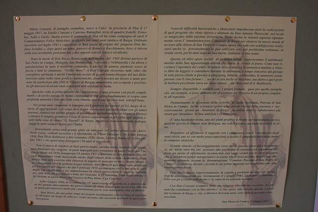 Sono partite ieri e continueranno oggi ed anche nella giornata di domenica 9 giugno, le celebrazioni per ricordare don Mario Consani, parroco di San Pietro in Campo per 38 anni, da tutti conosciuto come “Grillo Moro”. Proprio oggi, 2 giugno, ricorrono 30 anni dalla sua scomparsa e la comunità di San Pietro in Campo, che ancora ricorda con affetto il “Grillo Moro”, insieme all’Unità Pastorale, gli ha voluto dedicare una serie di appuntamenti che hanno preso il via ieri pomeriggio con l’inaugurazione di una mostra fotografica che ripercorre gli anni di don Consani a San Pietro in Campo. Tante belle immagini che riportano indietro negli anni, messa a disposizione da tutta la comunità. La sua opera di sacerdote; il suo contatto umano con la gente del posto, le tante iniziative messe in campo come ci ricorda anche il nipote Francesco Consani nell’audioboo che potete ascoltare in questo post, sono raccontate da queste fotografie in bianco e nero.