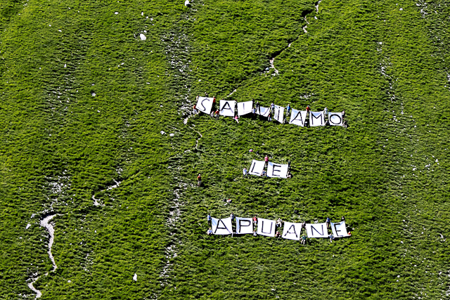 Ieri pomeriggio, domenica 16 giugno, l’associazione Aeliante che partecipa al movimento “Salviamo le Apuane” è giunta dopo tre giorni di cammino da Lucca, sulla Pania della Croce. Sul fianco del monte è stata allestita una scritta gigante “Salviamo le Apuane”. tanto per dare un’idea della sua grandezza, ogni lettera era sorretta da 4 persone.