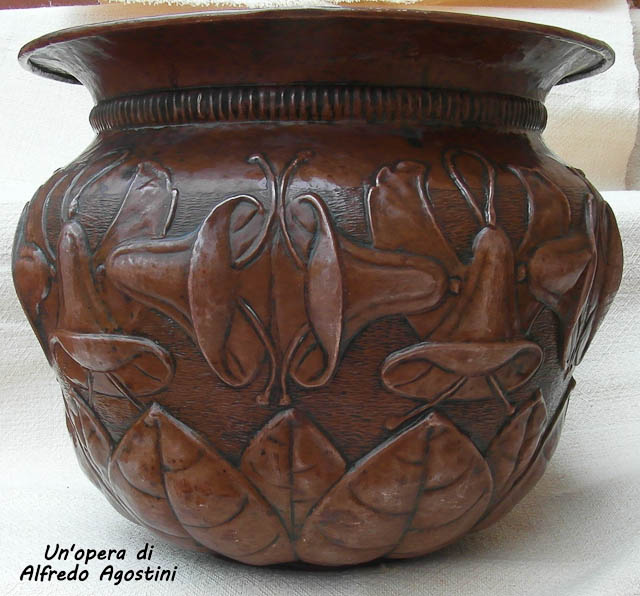 Entro. Nei due stanzoni, sotto la luce che piove opaca dalle lampadine penzolanti dalle travi del soffitto, è quasi palpabile l’atmosfera di un’epoca tramontata per sempre. I muri, su cui la patina del tempo si è raggrumata, sembrano rimandare l’eco dei colpi di martello sul rame e sul ferro dell’Alfredo, Alfredo Agostini, e del suo ragazzo di bottega, anche lui Alfredo, Alfredo Piol, che del Maestro scomparso prematuramente a quarant’anni, ereditò l’operosità e l’arte.